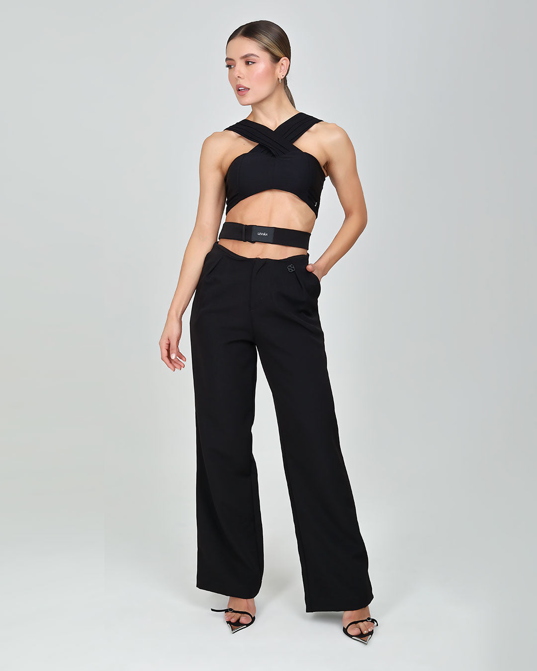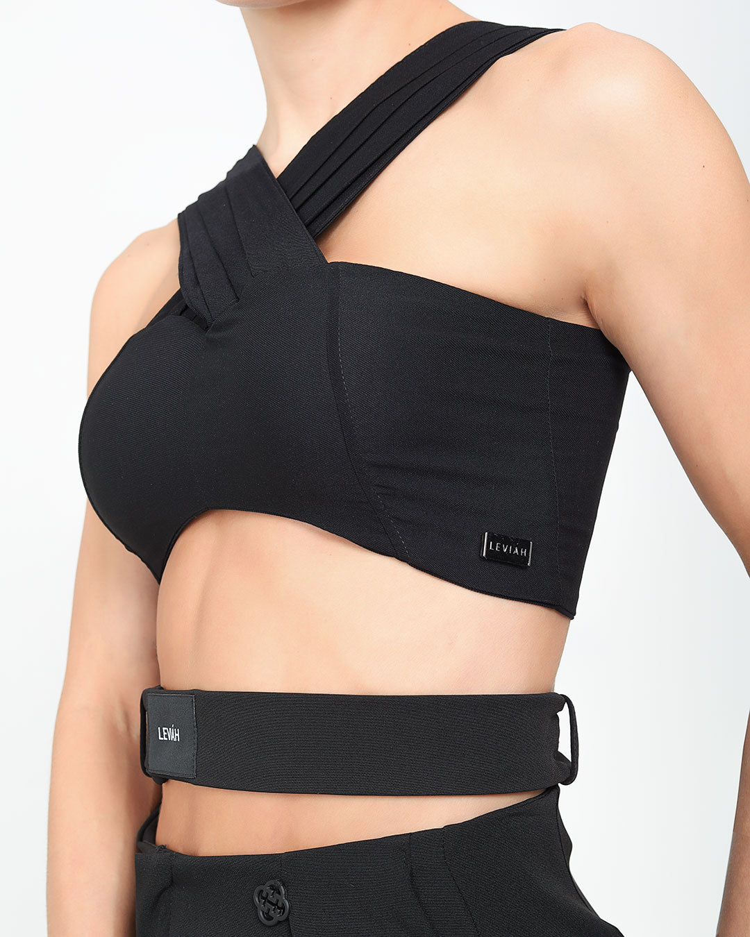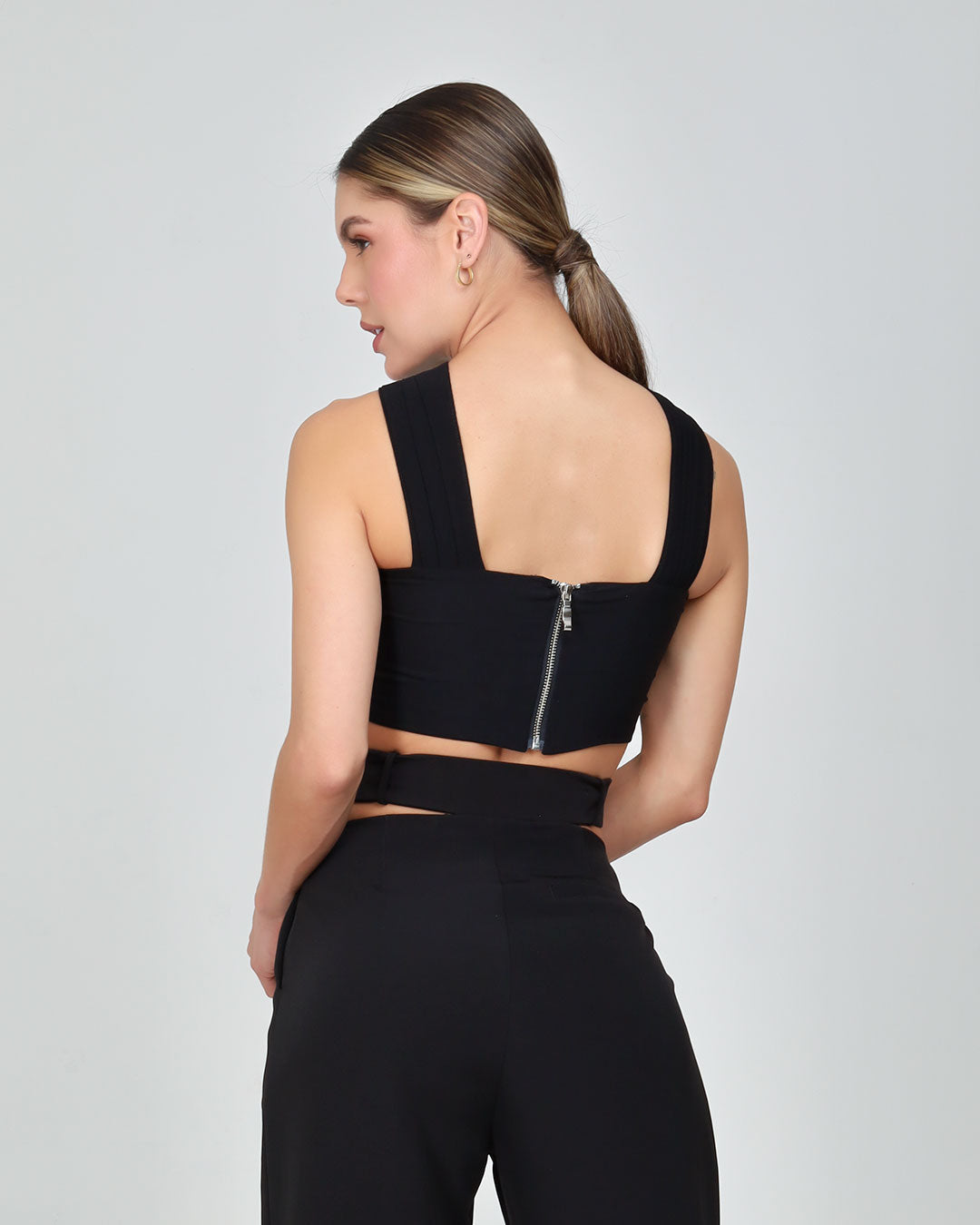 Este crop top combina elegancia y modernidad en un diseño cruzado que se entrelaza en la parte frontal, aportando un toque de estilo y originalidad. Su cierre posterior y el aplique decorativo en el frente lo hacen una prenda única y atractiva. Perfecto para crear looks elegantes o casuales, según cómo decidas combinarlo.