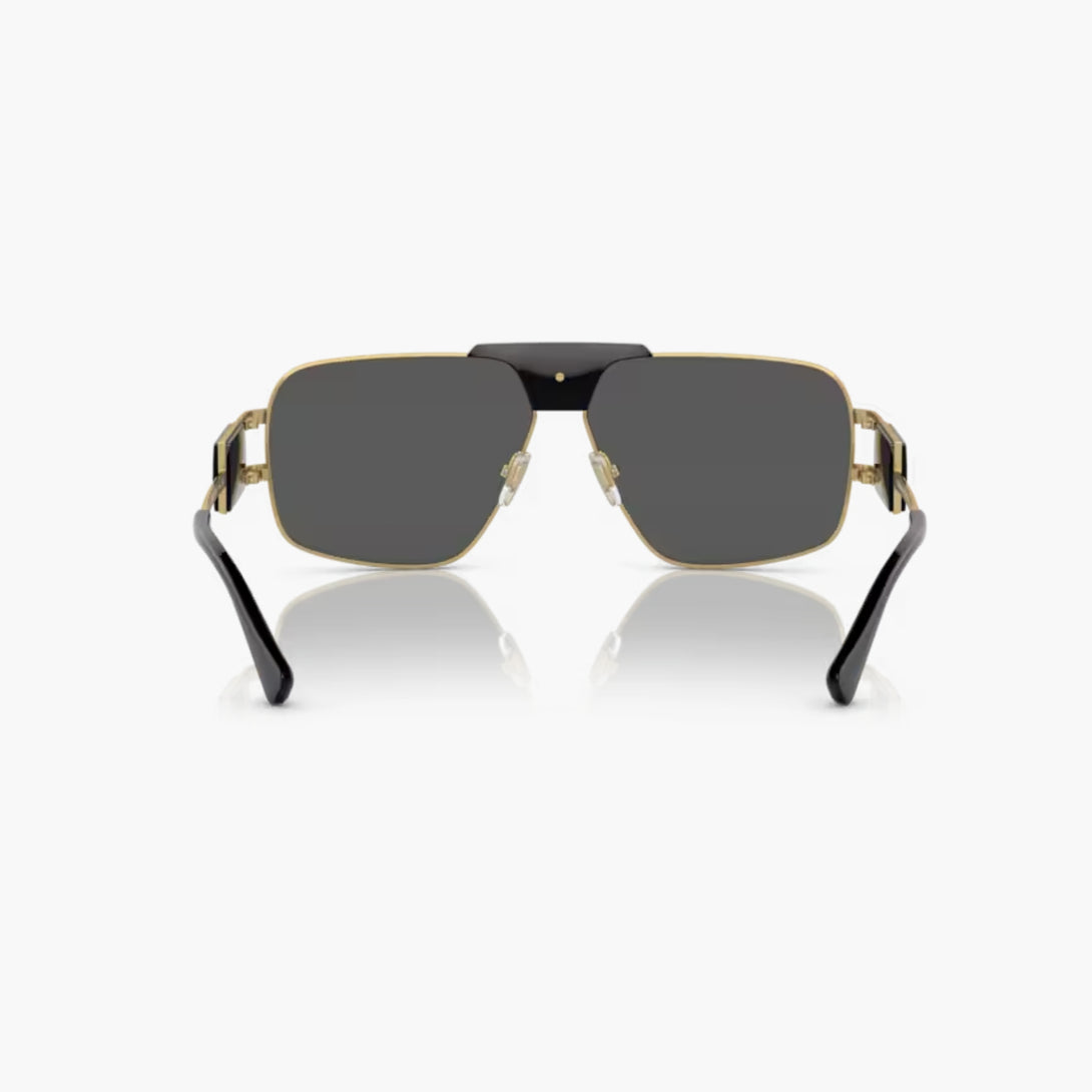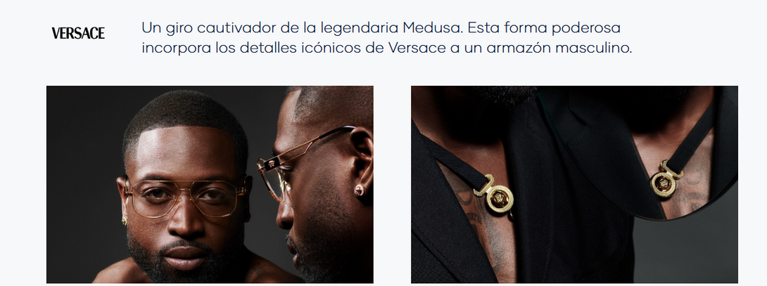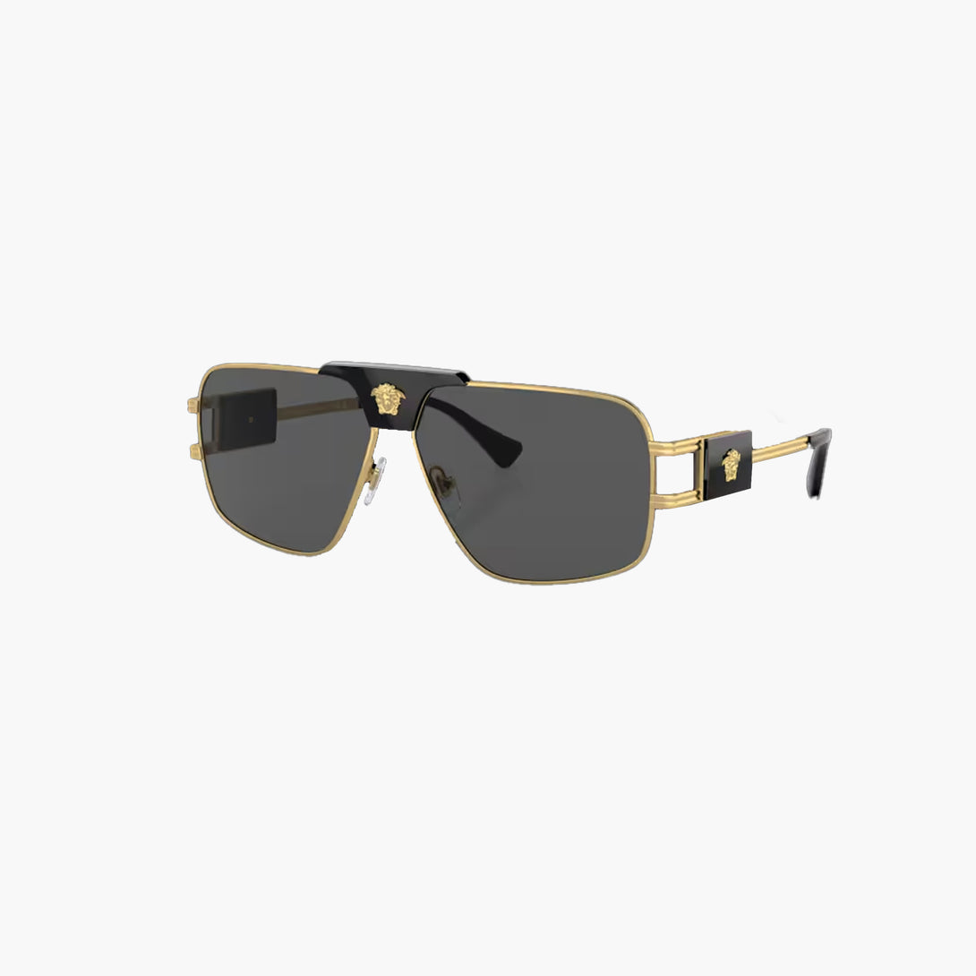 Forma piloto en opciones de color gris plomizo y dorado, con negro, habana y terminales de las varillas blancas en modelos oftálmicos; el icónico símbolo de Medusa de color en contraste en el puente y la varilla