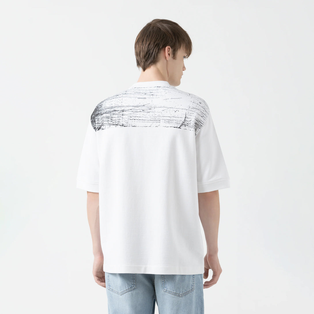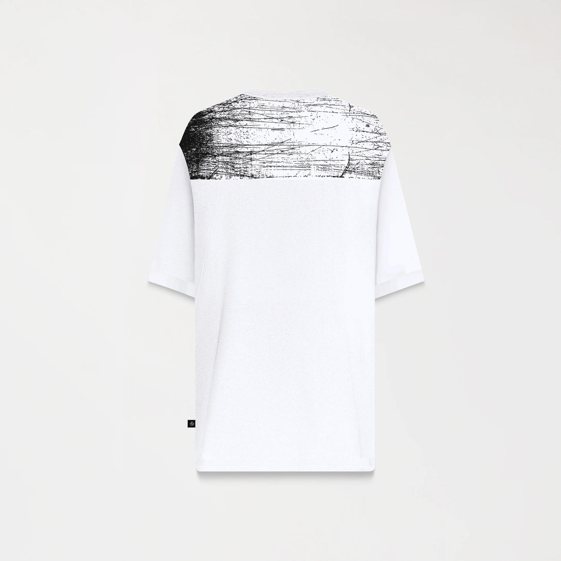 Su diseño incluye un cuello en rib de 2 cm, que aporta carácter y definición. En el frente y la espalda, los estampados en técnica de corrosión crean un contraste visual potente, resaltando la identidad gráfica de la prenda.