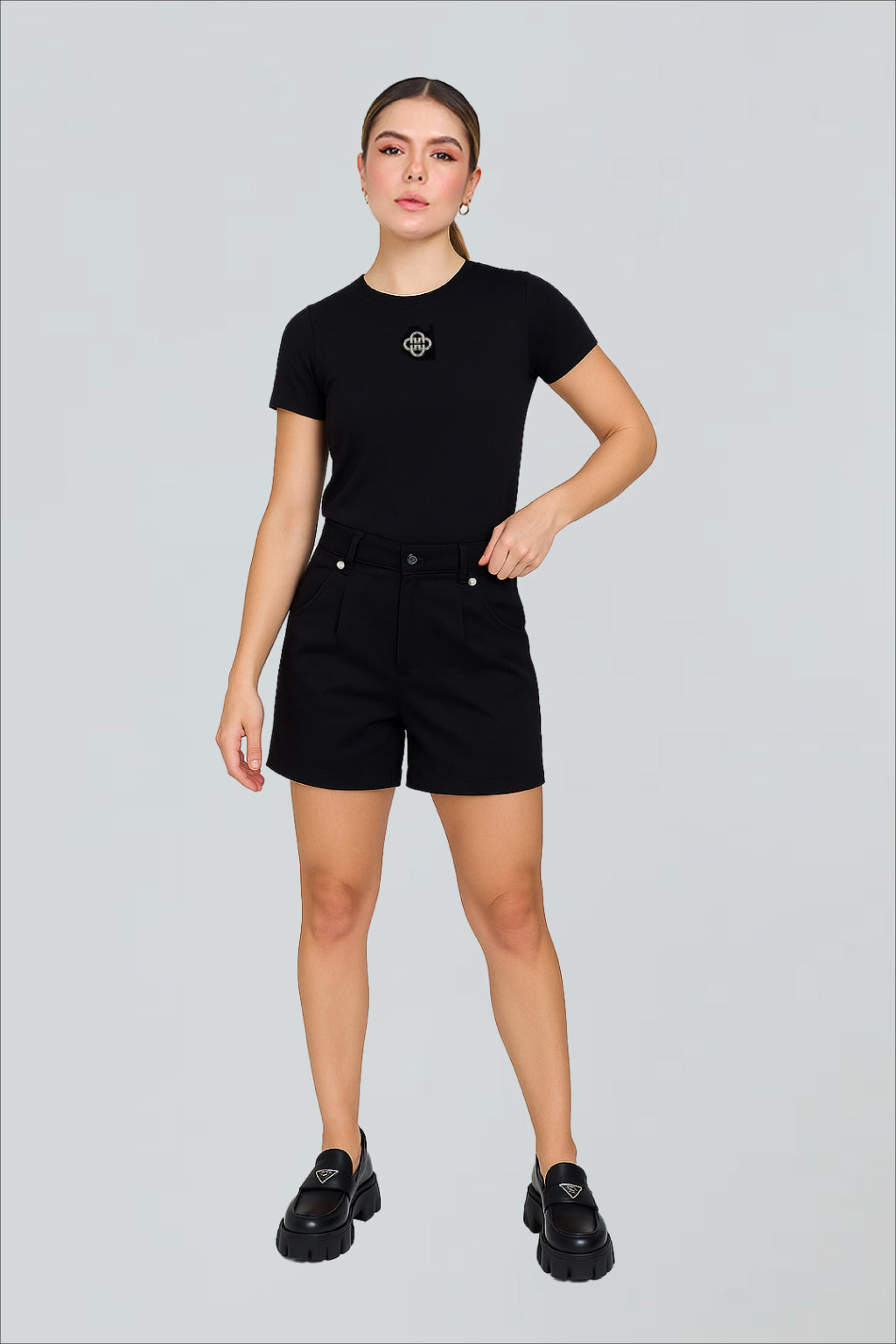 Camiseta de manga corta y cuello redondo, con aplique metálico en la parte de adelante que le aporta distinción. Su silueta ajustada es ideal para usarla en tus looks casuales ya que combina lo clásico, con la comodidad y la versatilidad.