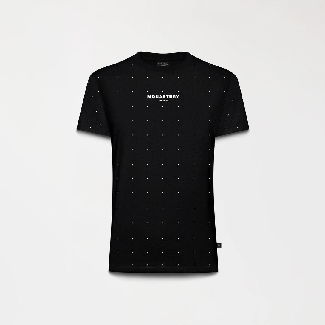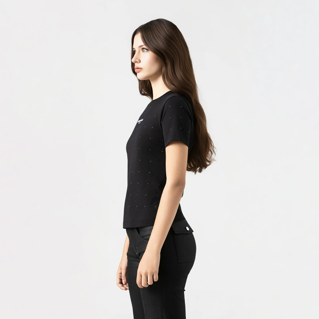 T-shirt femenina elaborada en silueta pequeña pensada para resaltar la figura femenina, atreves de su base textil, fresca y ajustada. Qylla es una referencia intervenida con aplicación de cristales ubicados de forma continua en toda la prenda, dispuestos con precisión para generar un efecto dinámico, contiene el logo Monastery couture en centro frente en técnica transfer el cual refuerza el contraste visual sin restarle protagonismo al diseño, la parte posterior cuenta con artes insignia en estampado plano ideal para destacar desde la elegancia.