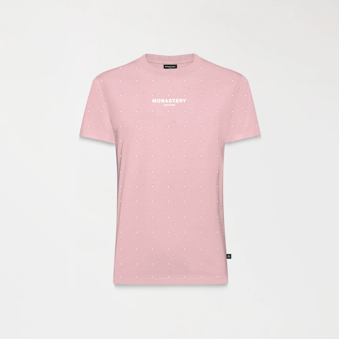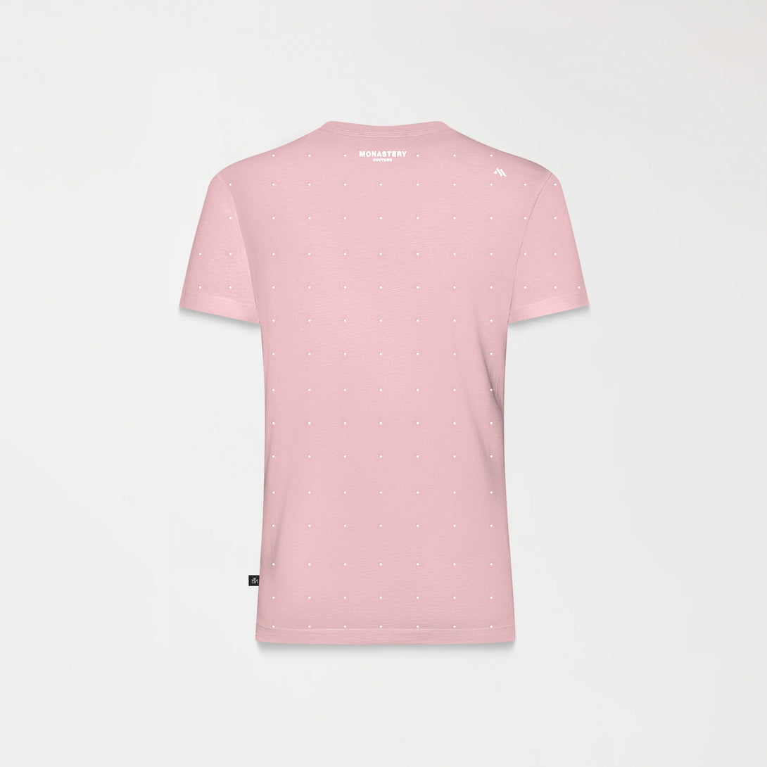 T-shirt femenina elaborada en silueta pequeña pensada para resaltar la figura femenina, atravez de su base textil, fresca y ajustada. Qylla es una referencia intervenida con aplicacion de cristales ubicados de forma continua en toda la prenda, dispuestos con presicion para generar un efecto dinamico, contiene el logo Monastery couture en centro frente en tecnica transfer el cual refuerza el contraste visual sin restarle protagonismo al diseño, la parte posterior cuenta con artes insignia en estampado plano ideal para destacar desde la elegancia.
