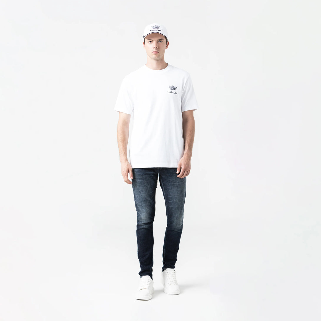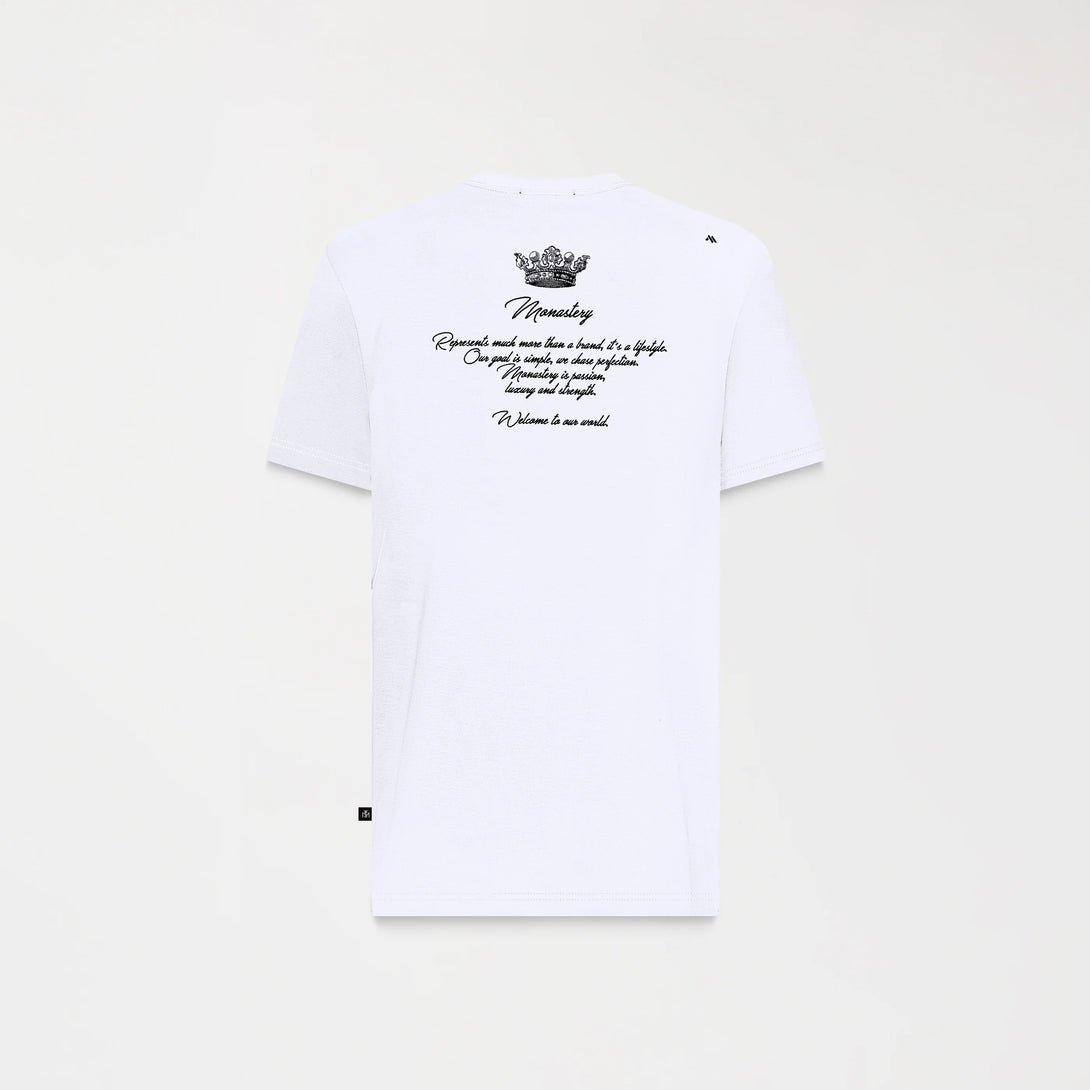 Camiseta para hombre en 100% algodón exclusivo para Monastery, elaborada en silueta regular con cuello de 2,5cm, presenta arte corona con logo Monastery en punto corazón bajo técnica de bordado plano y arte Monastery The king en espalda en técnica de bordado plano y alta densidad. Warsel es una prenda con un arte icónico renovado, haciendo este articulo fácilmente reconocible, muy versátil para combinar con tu vestuario.